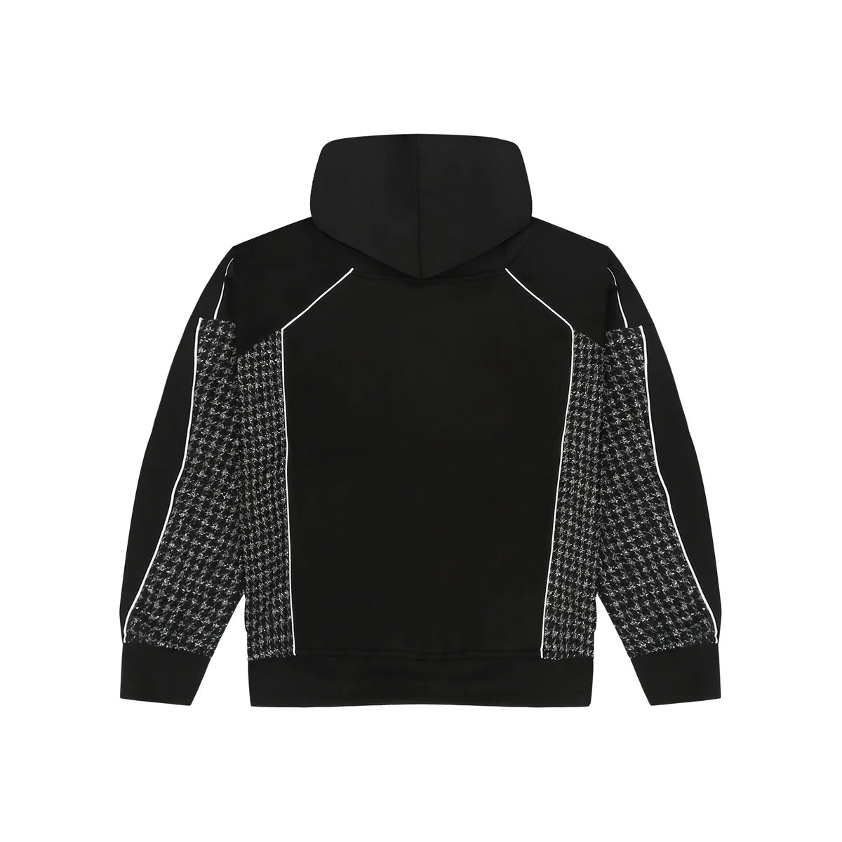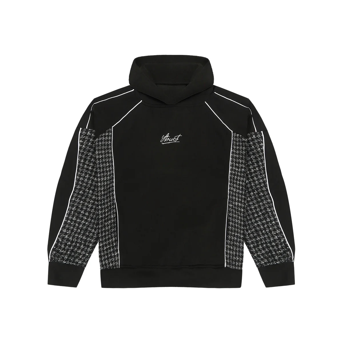 A contemporary hoodie merging traditional houndstooth tweed with modern athletic/streetwear silhouette. Features contrast white piping throughout and signature "Struct" script embroidered on the chest. Cut with a panelled construction, showcasing houndstooth sleeves and side panels against a lightweight, brushed cotton fleece body. Finished with ribbed cuffs and bottom hem.