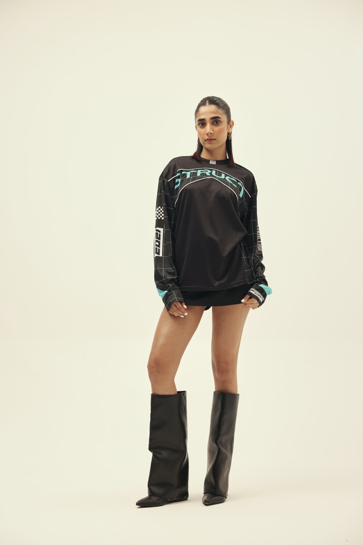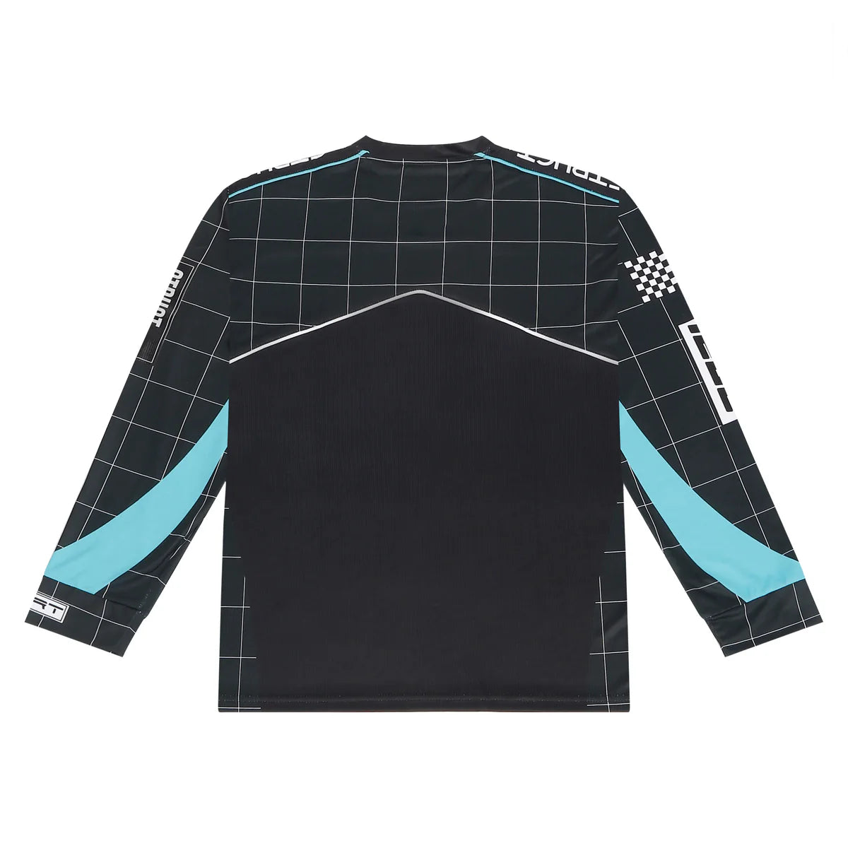 The sixth instalment in the Struct Sports Club Jersey series, this piece takes inspiration from Formula 1 racing. It features the signature F1 quilted suit check pattern printed across the shoulders, sleeves, and side panels, alongside a checkered flag patch and other motorsport-inspired motifs at the sleeves. A structured crew neck frames the look, while the bold Struct script spans the chest. Cut oversized from breathable performance knit, balancing athletic function with a relaxed fit.